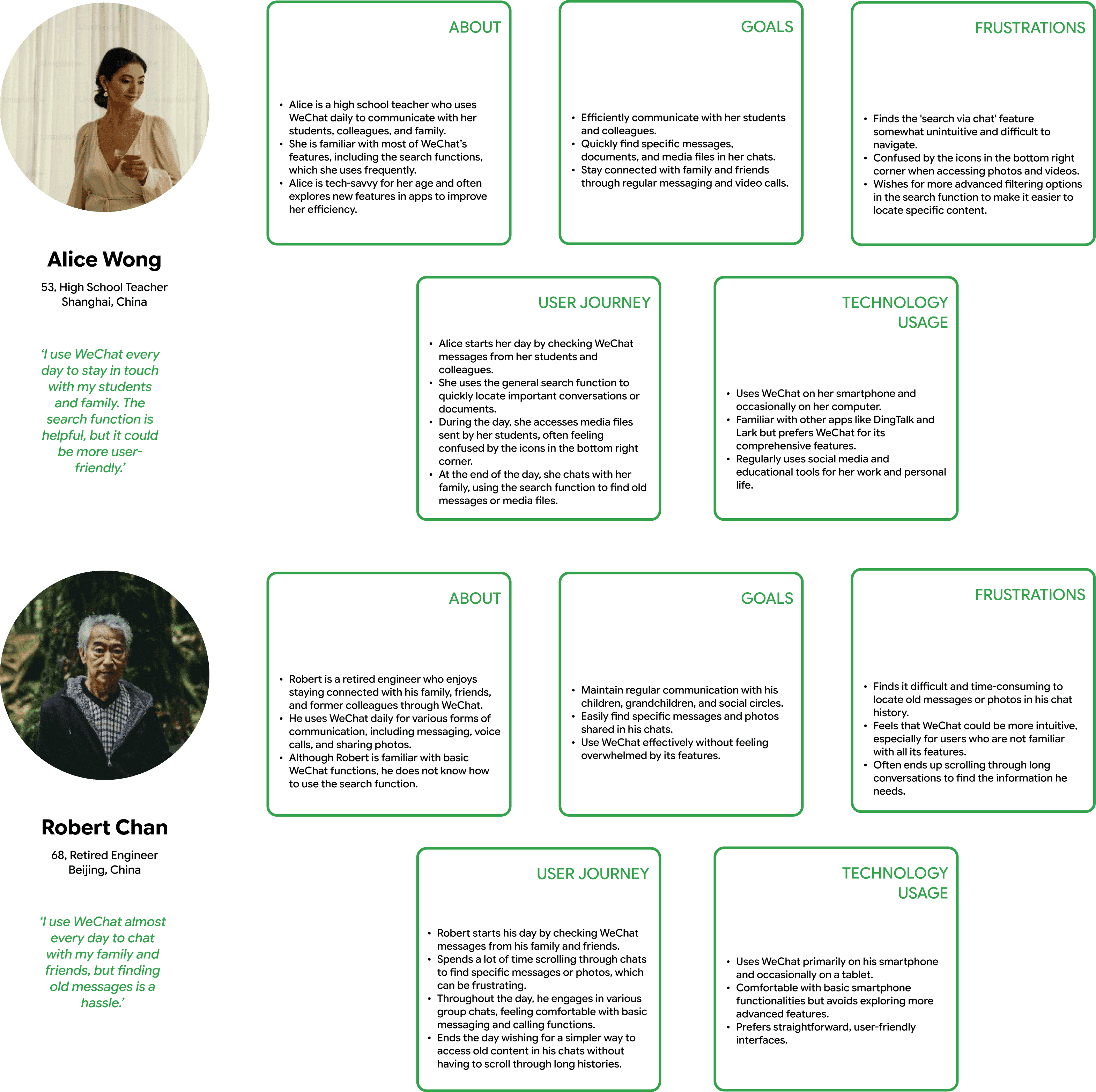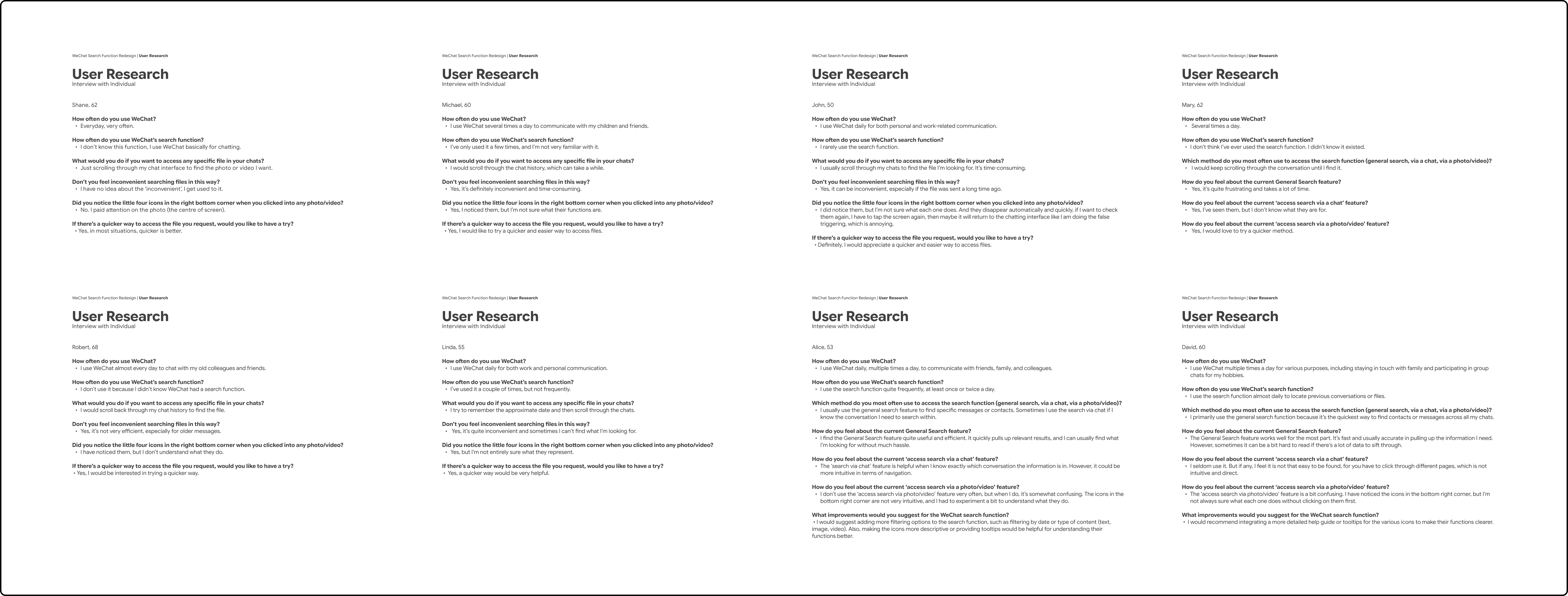 This drawback particularly affects the middle aged and older adults, who often scroll through chat history for a long time to find specific pieces of information. Many of them have no idea what 'search function' is, and there's no instruction leading them to get familiar with it.