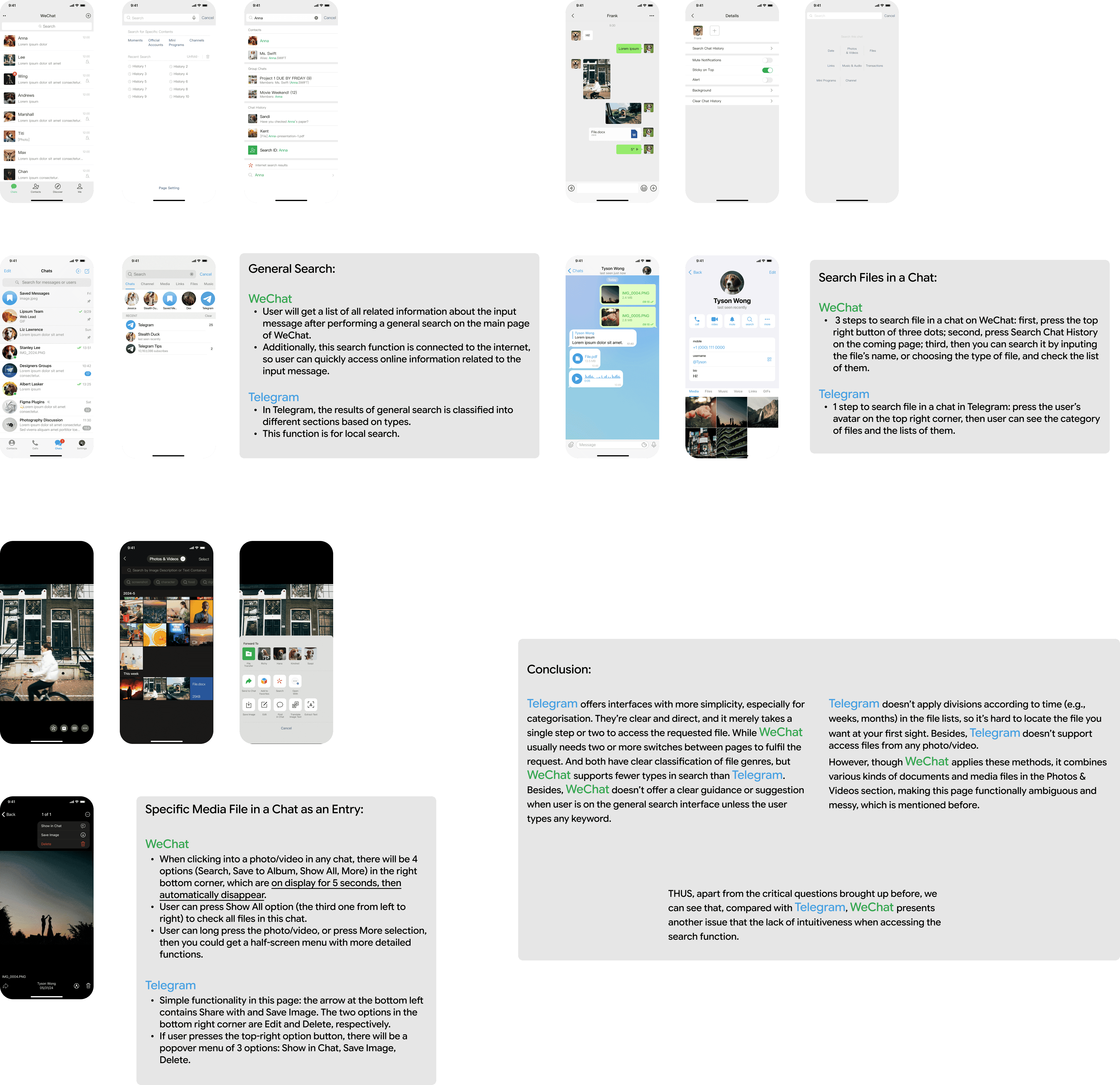 Second, I conducted a competitor analysis between WeChat and another globally popular instant messaging app, Telegram, to analyse the current features of WeChat’s search function and better understand what needs improvement in the user experience;