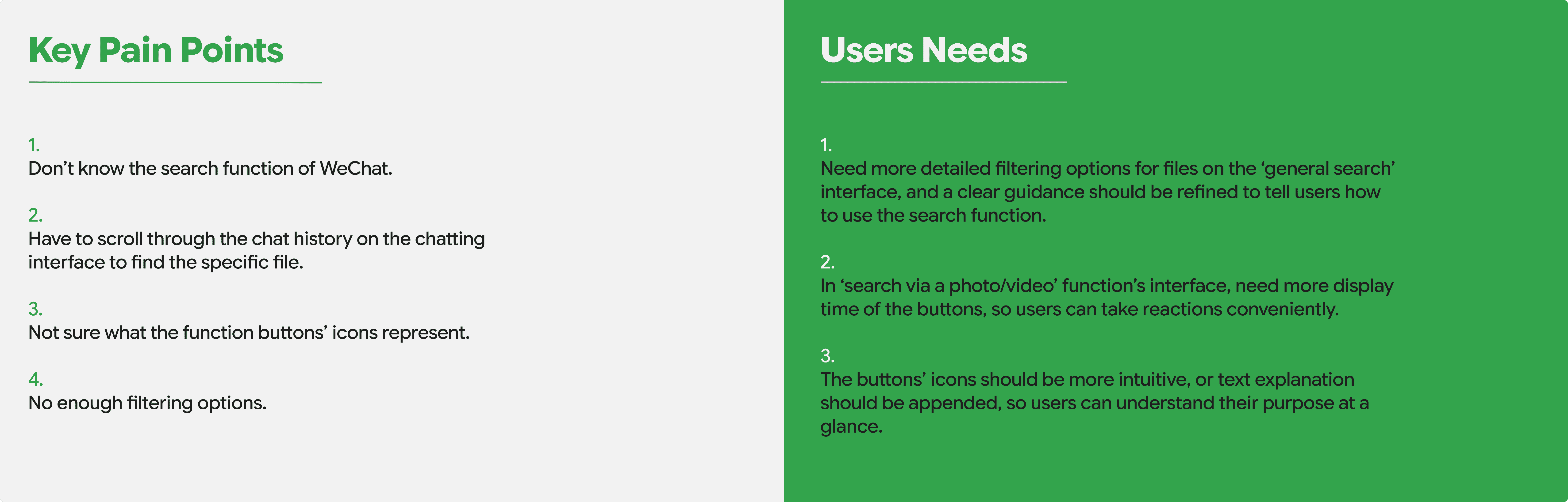 Lastly, I identified the pain points of this function and the users’ needs to serve as the foundation for the redesign.