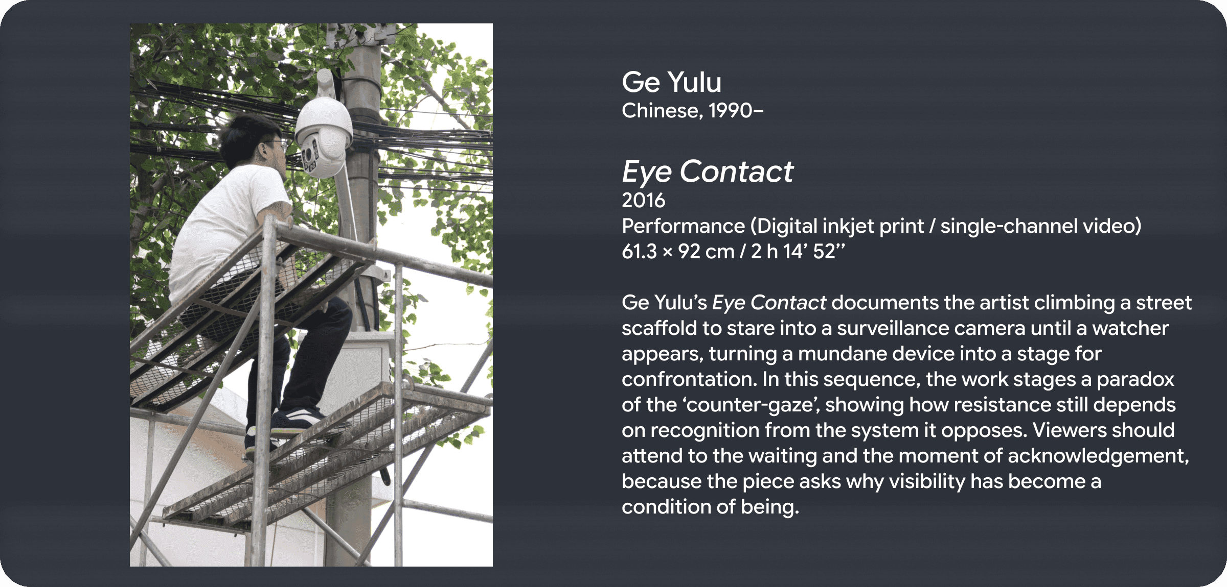 Treating the gaze as a regime that binds existence to visibility and claims the right to define, the exhibition maps how subjects become both ruler and captive within the same logic of recognition.