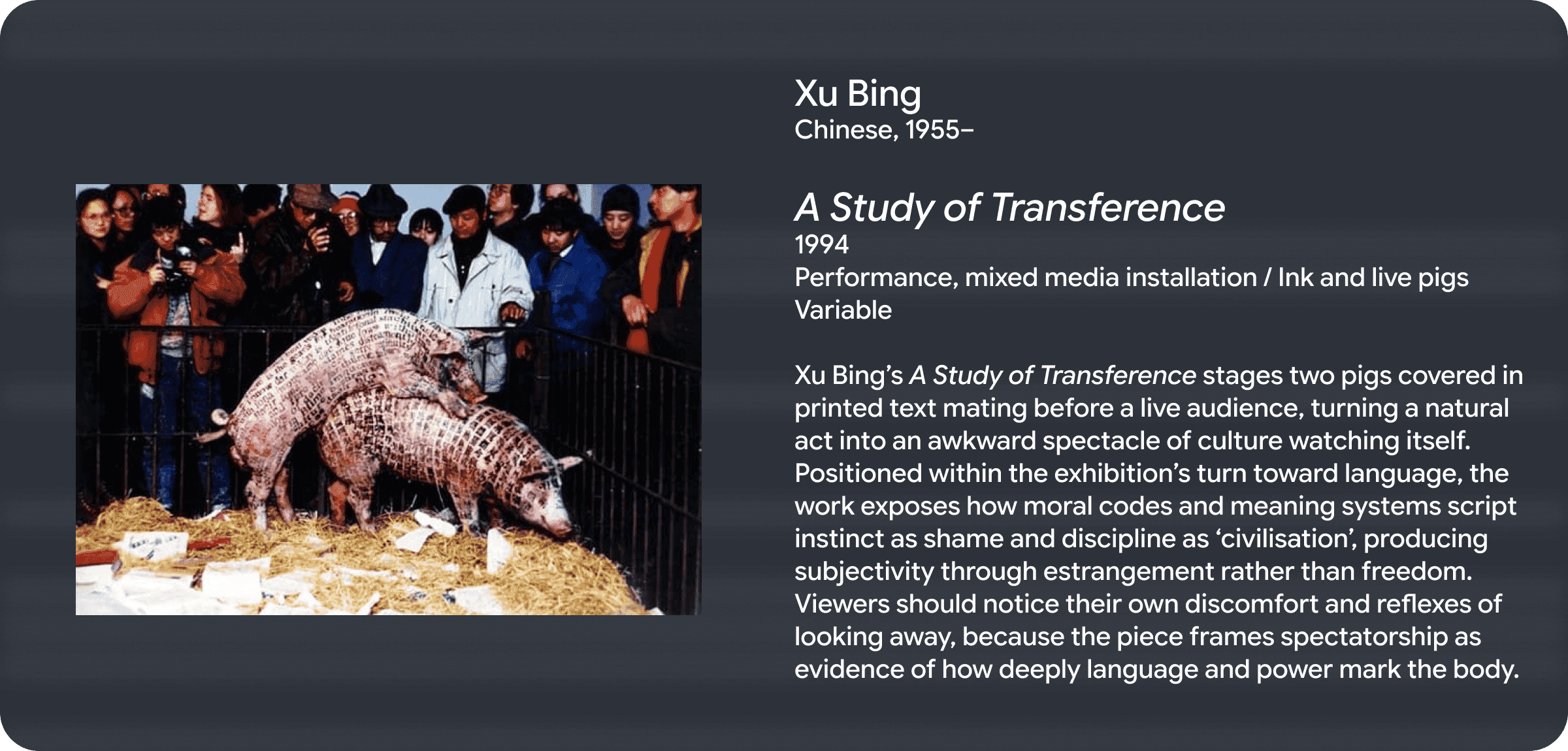 Across three movements, it tracks the grammar through which domination is internalised, including the ways refusal and silence remain legible within the system. The project asks what kinds of being might emerge beyond mastery and the need for assurance.