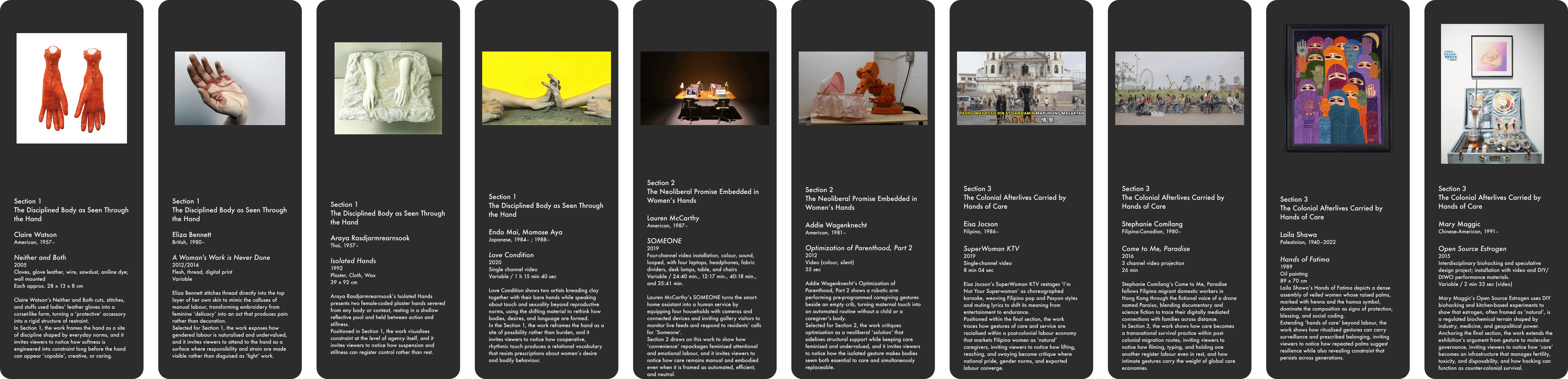 Care is organised through uneven histories of empire and migration, and these histories shape whose hands serve and whose bodies are allowed to rest. In this section, the hand registers the afterlife of colonial order as a living infrastructure of dependency, disposability, and intimate service. Viewers are asked to attend to how ‘care’ is racialised and outsourced, and how devotion can mask extraction and fatigue becomes normalised.