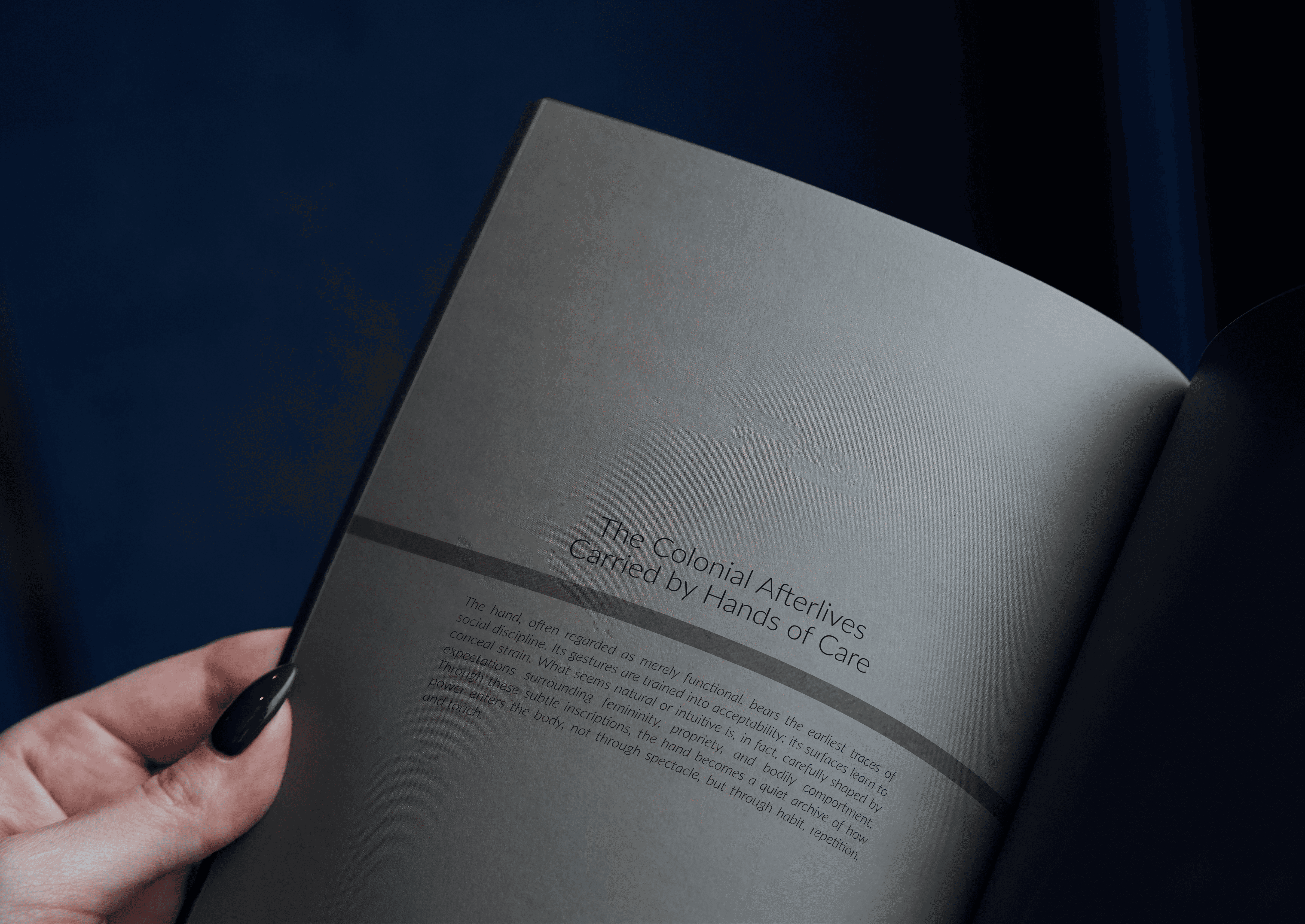 Across the works here, the hand emerges not only as a tool, but as evidence — evidence of how bodies are patterned by neoliberal demands for self-management, by patriarchal narratives of virtue and sacrifice, and by post-colonial hierarchies that determine whose labour is visible and whose suffering is tolerable.